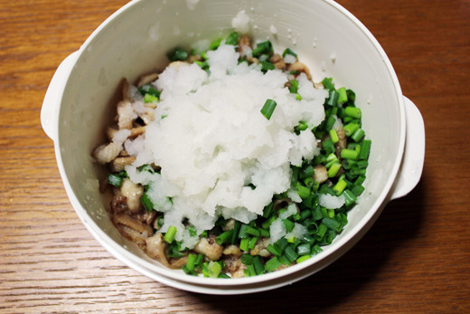 鳥皮ポン酢。鳥皮を油抜きして大根おろしと子ネギを乗せ、ポン酢をかけて食します。
