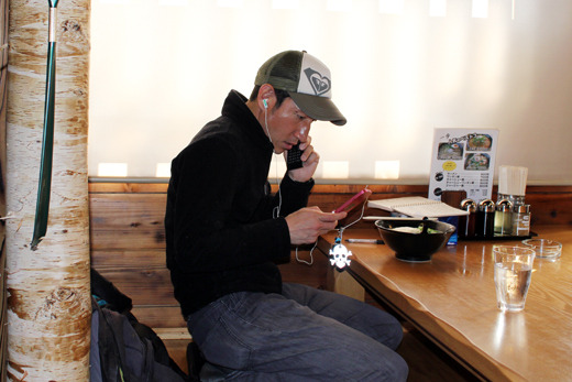 一人で来店し、携帯電話で中継する藤田君。機材とかもっとあるのかと思ってました。