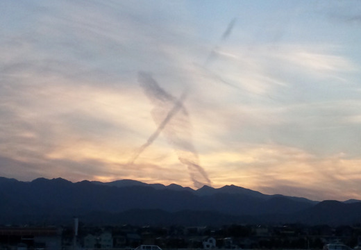 左下に流れる細いのはたぶん飛行機雲。では、右下に流れる太いのは。。。?