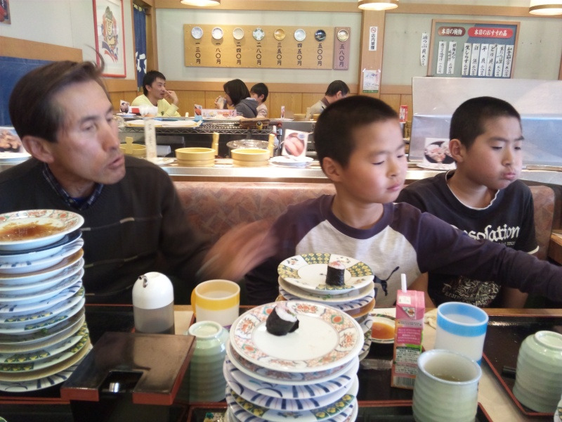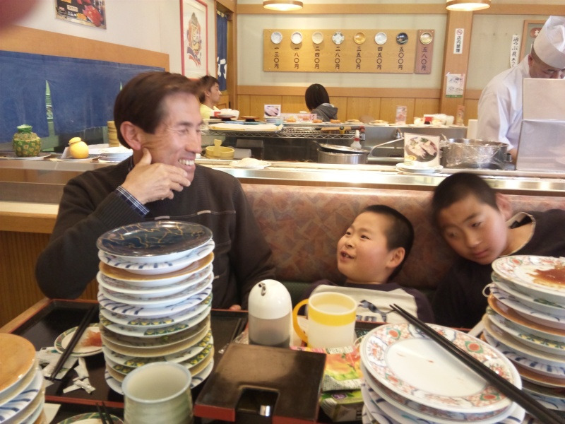 合格と寿司でご機嫌のぶん次男とからかって面白がるぶん親父。