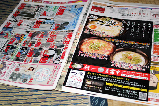 というのも、本日の朝刊に納品させていただきました「麺や一歩」様のチラシが