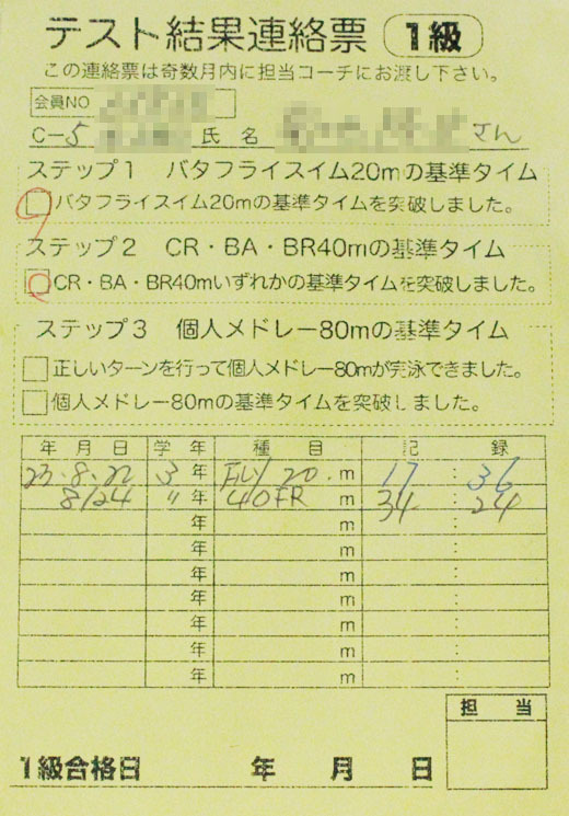基準タイムが39.6秒ですから、なかなか良い感じ。次は二ヵ月後にステップ3で個人メドレーです。これから苦手の平泳ぎとターンの練習をしなければなりませんね。