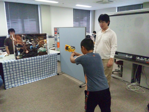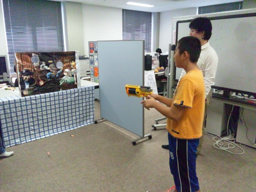 プログラム開発を先行している学生達がやっていた射的。上手く打ち抜くとお菓子が貰えます。