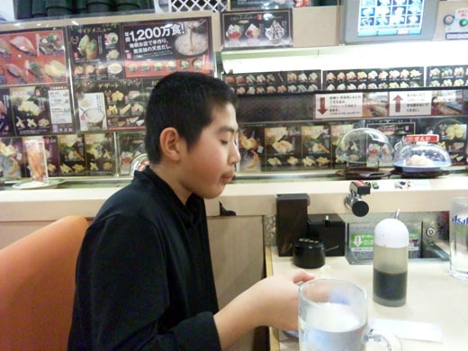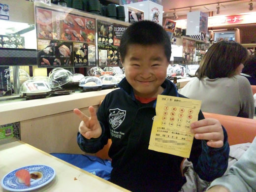 お店を出た後に枚数を自慢するぶん長男。本日は61皿+サイド3つで6,814円也