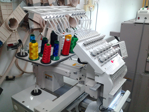 刺繍の機械。刺繍は色数ではなく、いくつ針を打ったかで金額が変わります。