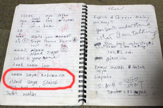いいやと思って注文した食事を皆に振舞って、持っていたノートに「What’s your name?」と書き、「Can you write Malay?」とか言ってコミュニケーションを取ってみました。すると何となく理解でき、少しだけコミュニケーション。彼女の名前はエレイン。上の写真に写っているビール飲んでるお姉ちゃんがそうで、そのテーブルの左端にいる禿げてるオッちゃんがお父さんだそうです。日本に興味があるみたいですね。
