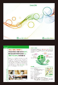 サイズはファイルにまとめやすいA4二つ折りのA5縦。フルカラー両面4色で、用紙は厚くて光沢のあるマットコート&ラミネートを使用する事にしました。ホワイトスペース多め、文字も大きめのすっきりとしたデザイン。シンプルですが自分らしい、会社案内らしい会社案内だと思ってます。