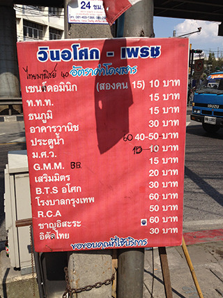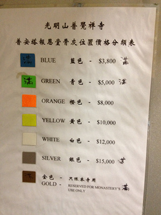 お墓の料金表。20センチ四方のロッカーに名前と写真が貼ってあり、横に付いている札の色によって料金が異なります。日本の戒名と同じようなシステムでした。
