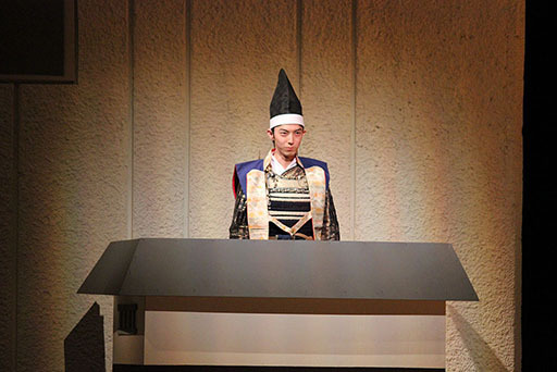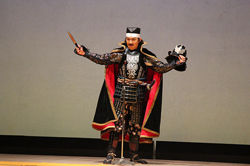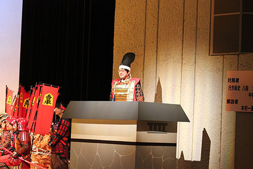 13:00から人間将棋がスタート。最初に織田信長が出て来て、東軍・西軍の決着を将棋で決めるよう両軍に言い渡します。東軍の指揮官が「中村大地 六段」、西軍の指揮官が「行方尚史 八段」です。