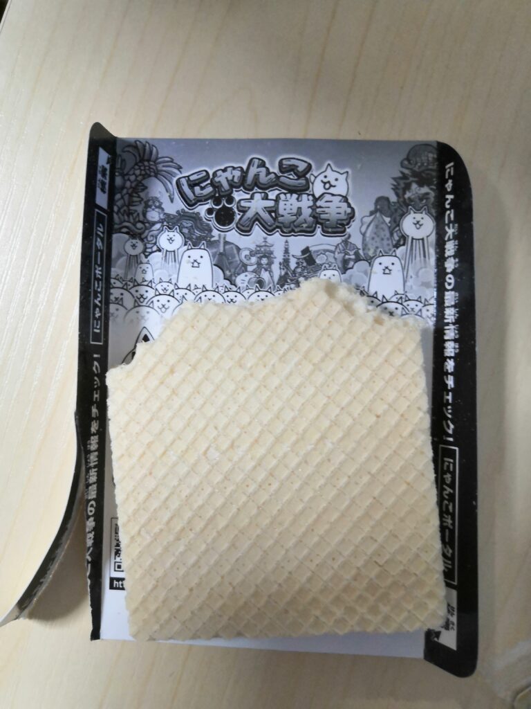 三男と一緒に試食。バニラクリームが2層入ったウェハース、程よい甘さで美味しかったです。中には全28種類のキャラクターカードが入っているようです。両面に印刷されていて超激レアは虹色に光るメタリック部分があります。おやつタイムに暫く楽しめそうです。ありがとうございました。