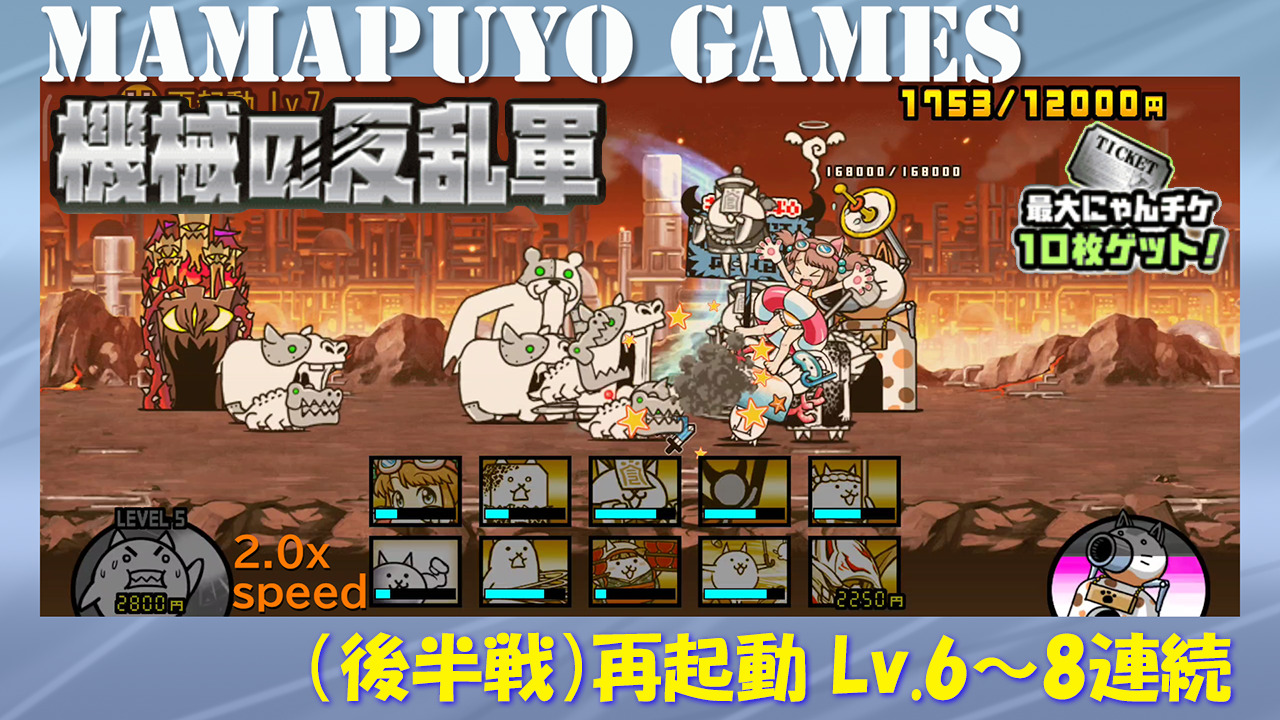 難攻不落の城とドラゴン 初登場!冠4 全3ステージ連続、機械の反乱軍(前半戦)再起動 Lv.1~5(にゃんこ大戦争プレイ日記509)
