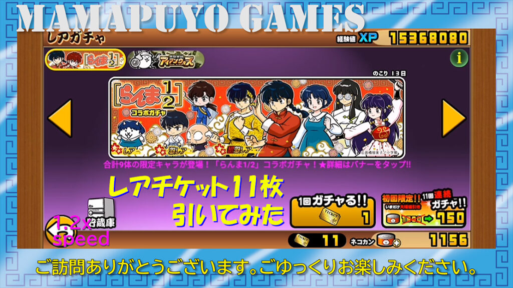 らんま1/2コラボガチャ レアチケット11枚引いてみた(にゃんこ大戦争プレイ日記261)