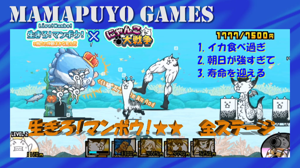 今日は生きろ!マンボウ!★2の イカ食べ過ぎ・朝日が強すぎて・寿命を迎える の3ステージを一つに纏めて動画を作りました。このステージはにゃんぼうが入手出来ます ...