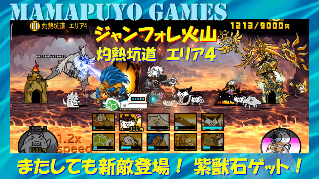 ジャンフォレ火山 灼熱坑道 エリア4 またしても新敵登場! 紫獣石ゲット!(にゃんこ大戦争プレイ日記411)