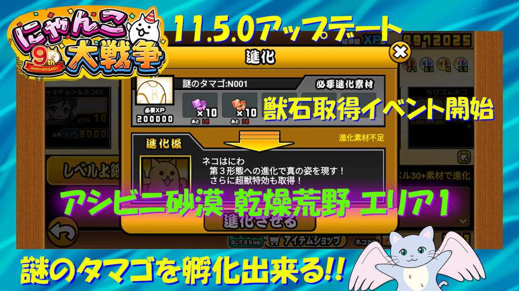 11.5.0アップデートで古びたタマゴを第三形態に!! アプデ追加要素紹介と新ステージ挑戦(アシビニ砂漠 乾燥荒野 エリア1)、続・4月強襲! 新春だよ!Lv.15, MAX(にゃんこ大戦争プレイ日記404)