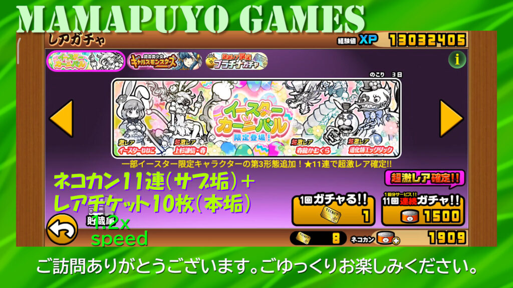 イースターカーニバル 超激レア確定11連(サブ垢)+レアチケット10枚(本垢)で挑戦(にゃんこ大戦争プレイ日記401)