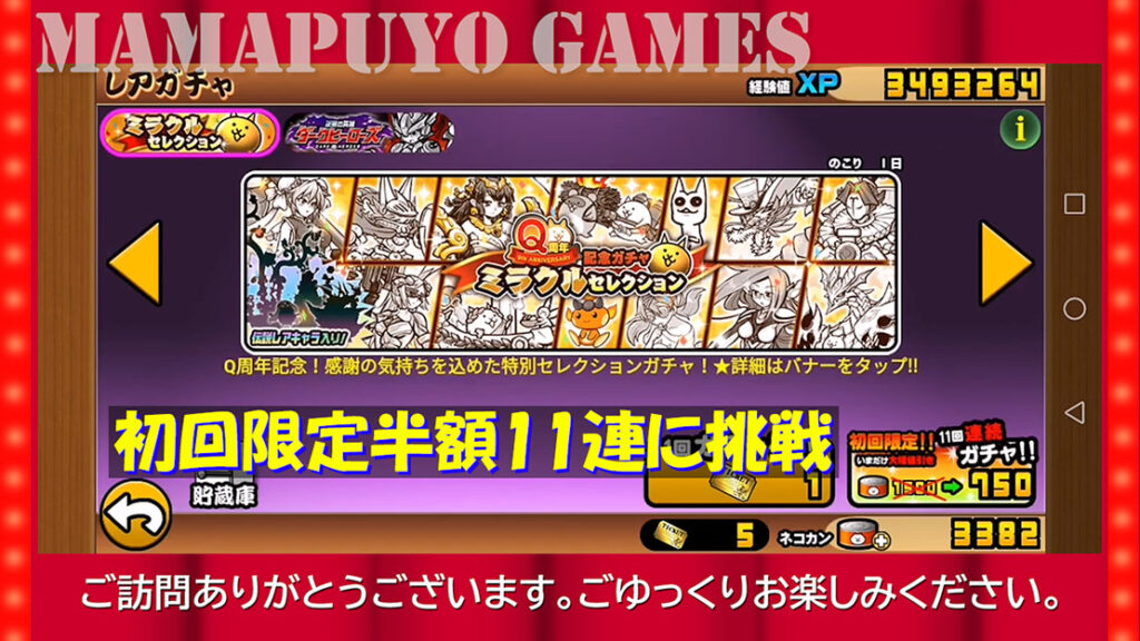 Q周年記念ガチャミラクルセレクション 初回限定半額で11連に挑戦(サブ機)(にゃんこ大戦争プレイ日記348)