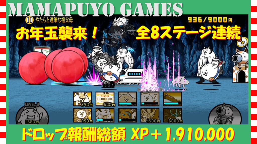 お年玉襲来! 全8ステージ連続 ドロップ報酬総額XP+1,910,000(にゃんこ大戦争プレイ日記355)