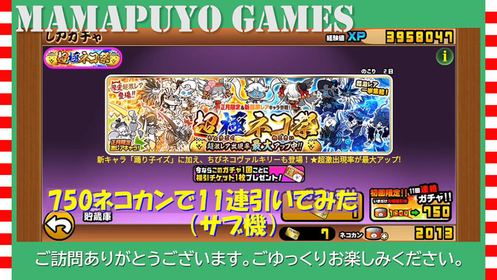 明けましておめでとうございます。本年もよろしくお願い致します。今日は元日より開催中の超極ネコ祭の動画を編集しました。超ネコ祭と極ネコ祭の超激レアや正月限定キャ ...
