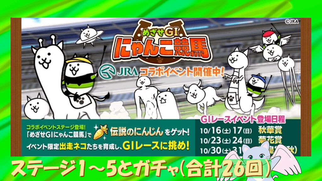JRAコラボイベント めざせGI にゃんこ競馬 ステージ1~5とガチャ(合計26回)(にゃんこ大戦争プレイ日記325)