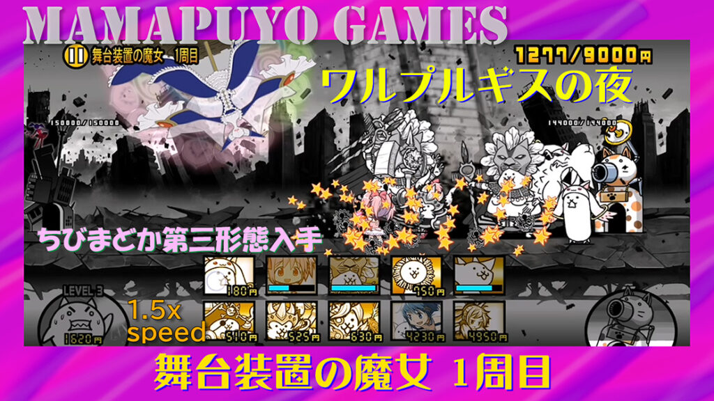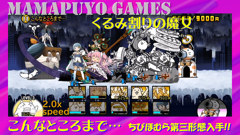 まどか☆マギカコラボ 続・魔法少女になってよ 君は神にでもなるつもりかい? ネコキュゥべえ入手(サブ機)、続・9月強襲! Revenger Lv.15, Lv.MAX プラチケのかけら入手、まどか☆マギカコラボ くるみ割りの魔女 こんなところまで… ちびほむら第三形態入手(サブ機)(にゃんこ大戦争プレイ日記311)