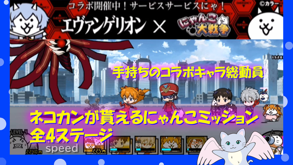 今日は エヴァンゲリオンコラボ ネコカンが貰えるにゃんこミッション 全4ステージ(1.決戦!ヤシマ作戦 二子山第2要塞 2.発進!エヴァンゲリオン 特別非常事 ...